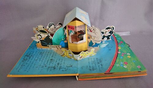 ★「国松さまのお通りだい」(とびだすえほん)P.9、10の映像と本文 <本文> 「まいど ありい。」 国松くんの おとうさんが できたてのラーメンを 岩波先生に わたしました。 ここは、いつも おとうさんが 屋台をだす 公園です。 「うまい。おたくの ラ…