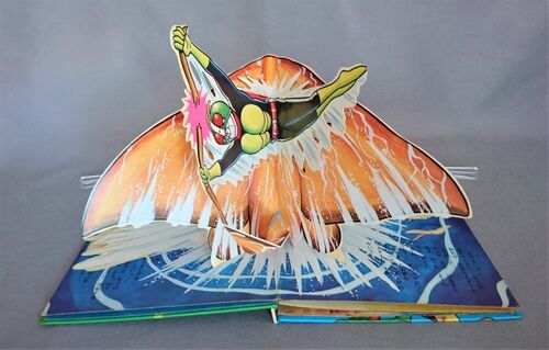 ★「仮面ライダー4変身!ライダージャンプ」(とびだすえほん)P.7、8の映像と本文 <本文> エイキングに あやつられた エイの群れが、仮面ライダーをとり囲んだ。 エイが 飛び はねると、海は 狂った ように 荒れ だした。 「それっ、ライダー グリップ…