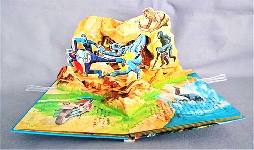 ★「仮面ライダー3 うなれ!サイクロン」(とびだすえほん)P.7、8の映像と本文 <本文> サイクロン号を とばして、オオカミ男を 不気味な 岩場に 追い つめた。 「オー、オー、オーン! みんな 出て こい。ショッカーの 恐ろしさしさを しらせて やるが…
