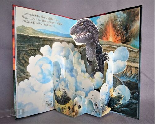 ★「GODZILLA ゴジラ」(ポップアップ)P.9、10の映像と本文 <本文> ゴジラの帰巣本能を 刺激する 超音波が ようやく 完成し、ゴジラは その 超音波に さそわれて、伊豆大島 三原山の 大噴火の 中へと 消えて行った。 ★「GODZILLA ゴジラ」(ポップアッ…