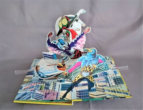 ★「仮面ライダー5 たたかえ!われらの戦士」(とびだすえほん)P.3、4の映像と本文 <本文> まわれ タイフーン、ふけよ かぜ。さあ けっせんの ときが きた。 「いくぞ ショッカー かい人ども、みんな まとめて あい手に なるぞ!」 東京の 空たかく、…