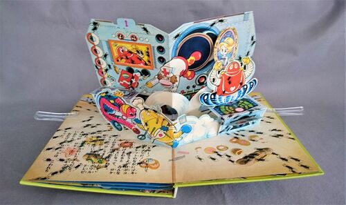 ★「がんばれ!! ロボコン」(とびだすえほん)P.3、4の映像と本文 <本文> 「きゃー! たすけて ゴキブリだ!」 ロケットのなかにゴキブリが うようよ。 ロボコンが にげまわると みんなも いっしょになって、ロケットのなかは おおさわぎ。 「うっひっひ…