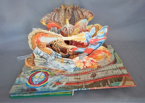 ★「帰ってきたウルトラマン3 地球大防衛戦」(とびだすえほん)P.1、2の映像と本文 <本文> 宇宙怪獣 大襲来 高速道路が、くもの 巣の ように のびる 大都会。 林の ように 立ちならぶ 摩天楼。 そのビルを 破壊し、食べ だした 怪獣が いた。 サターン…